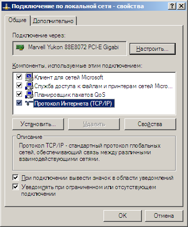 Подключение по локальной сети служит для получения доступа к ресурсам локальной сети, а также для запуска VPN-подключения к Интернет. Настройку подключения по локальной сети производить не нужно и оно должно работать сразу при подключении сетевого кабеля. Однако если настройки подключения были изменены (например при использовании в других сетях), то необходимо вернуть их в исходное состояние. Все параметры локальной сети (IP-адрес, маска, шлюз, DNS) выдаются сервером автоматически по протоколу DHCP. Однако физический адрес (MAC-адрес) сетевой карты должен быть зарегистрирован на сервере в первый раз при подключении.