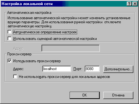 1) MS Internet Explorer, Netscape Communicator, Opera и другие web-браузеры. в установках прокси-сервера укажите в качестве прокси-сервера localhost, или IP-адрес 127.0.0.1, порт 8080