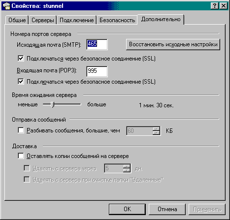 Почтовые клиенты Netscape Messenger и Outlook Express могут устанавливать соединение через SSL, популярный почтовый клиент The Bat! - нет. Для программ, поддерживающих SSL установка клиента Stunnel не нужна. Необходимо только правильно их сконфигурировать.